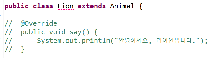 Lion 객체의 say()가 호출 될 때는 부모의 say()메소드 "안녕하세요, 동물 입니다."가 출력됩니다.