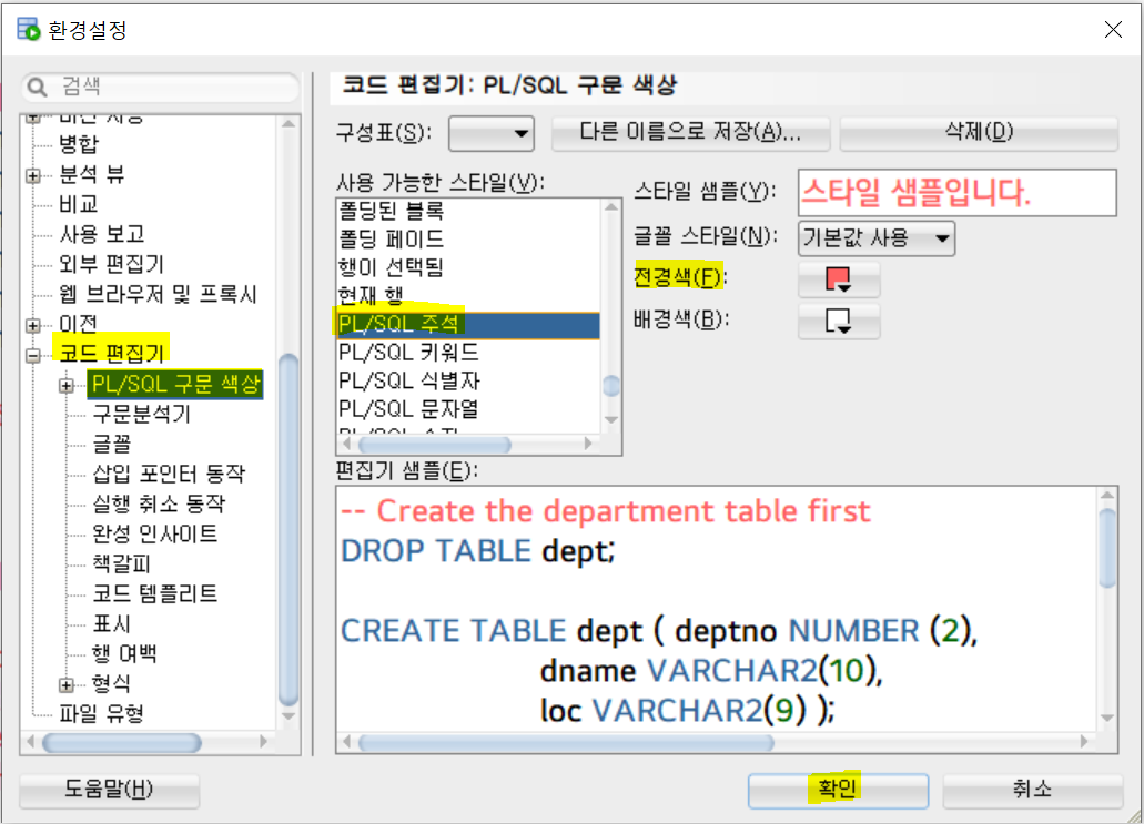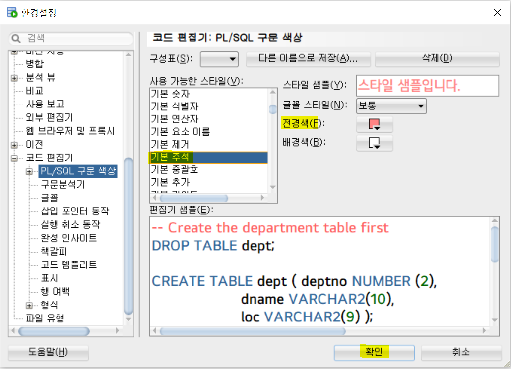 코드 편집기 - PL/SQL 구문 색상