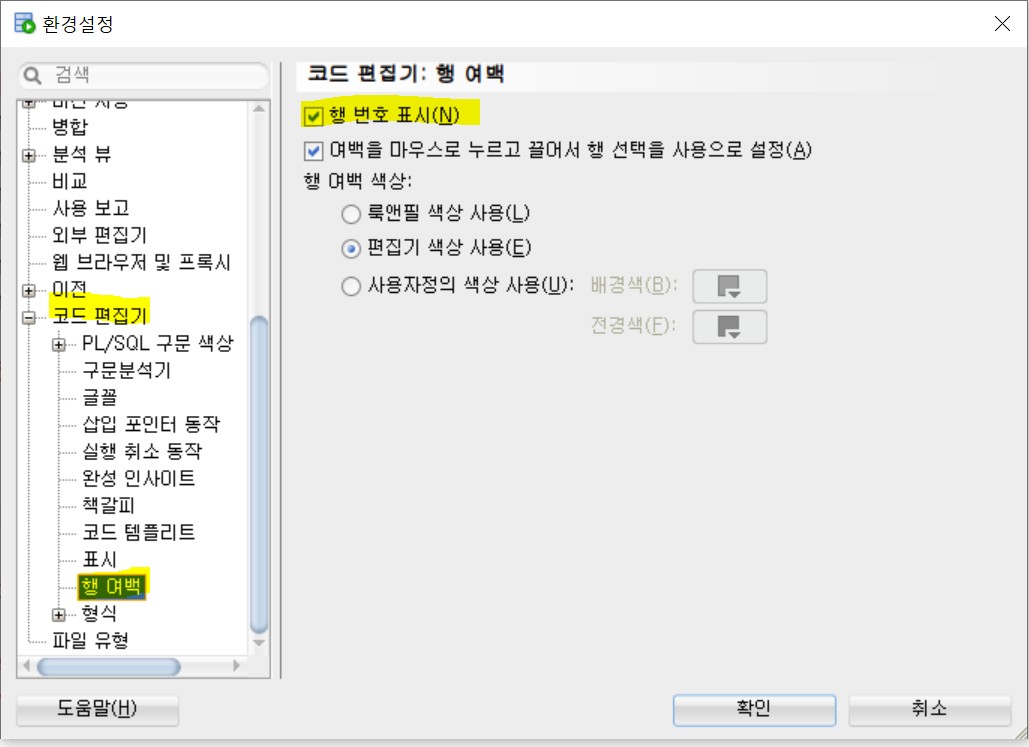 행 번호 표시에 체크 해준 후 확인 버튼을 눌러줍니다.