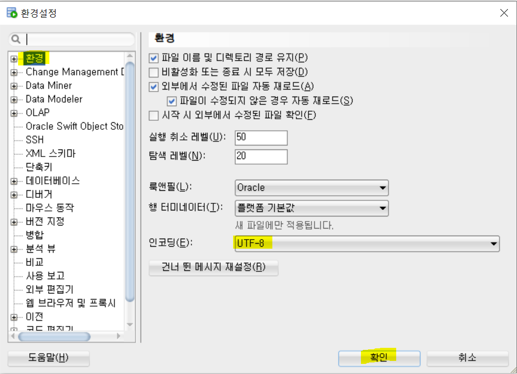 인코딩 형식을 UTF-8로 설정해주고 확인을 눌러줍니다.