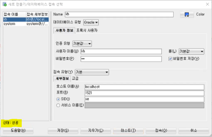 -- 상태: 실패 -테스트 실패: ORA-01045: 사용자 KH는 CREATE SESSION 권한을 가지고있지 않음; 로그온이 거절되었습니다