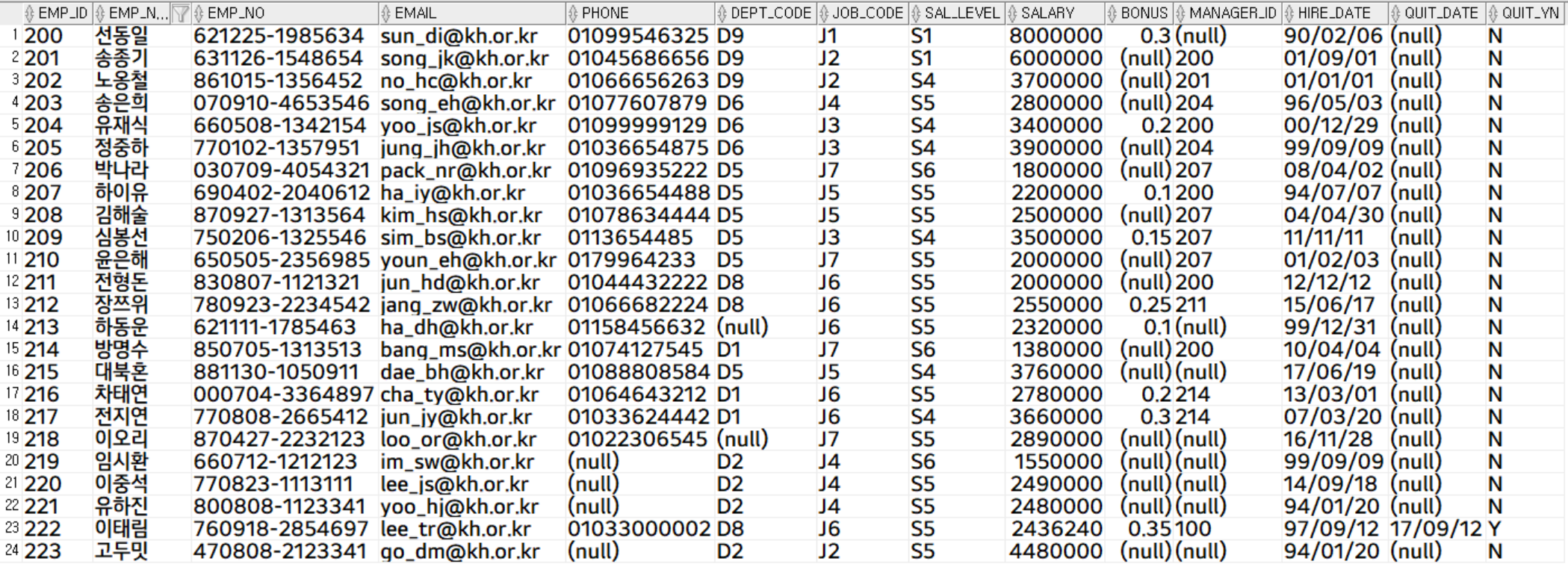 데이터들을 하나하나 살펴보면 알 수 있듯이, 부서/국가/직급/연봉 등의 데이터들을 나눠서 관리하고 있다는 것을 알 수 있습니다.