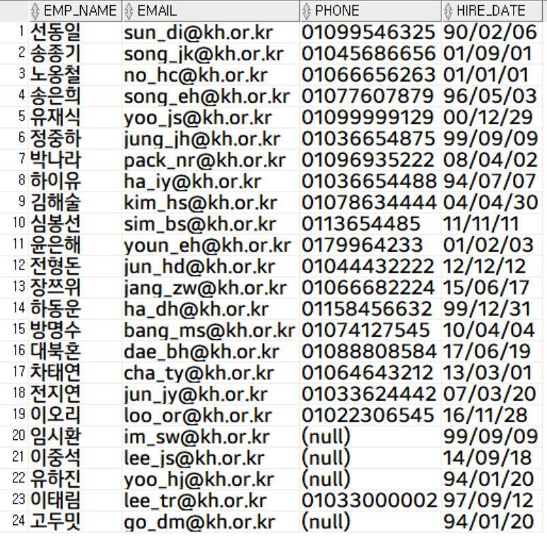 -- 사원테이블에서 이름, 이메일, 전화번호, 입사일을 출력