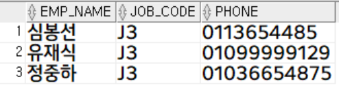 -- 사원테이블에서 직급코드가 J3인 사원 조회(사원명, 직급코드, 전화번호), 이름 오름차순