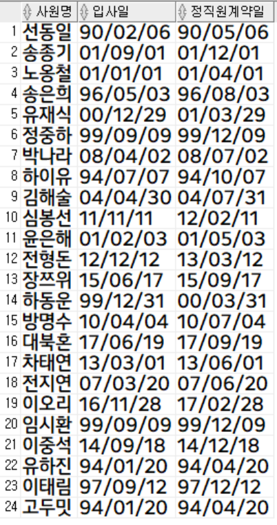 응용) 사원 테이블에서 입사 후 3개월은 수습 기간이다. 정신 직원이 된 일자는 각 사원 별 조회 (사원명, 입사일, 정직원계약일)