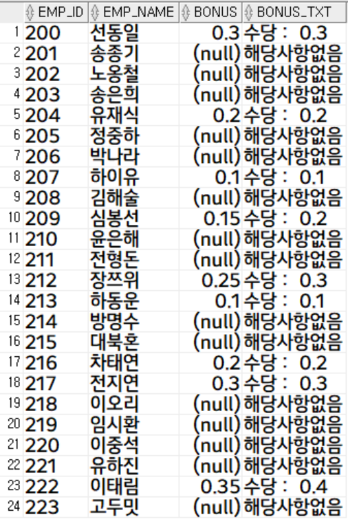 ☞ nvl(value, null일 때 값), nvl2(value, not null일 때 값, null일 때 값)