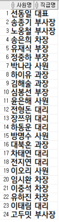 -- decode(job_code, 'J1', '대표', 'J2', '부사장', 'J3', '부장', 'J4', '차장', 'J5', '과장', 'J6', '대리', 'J7', '사원') --동일!!