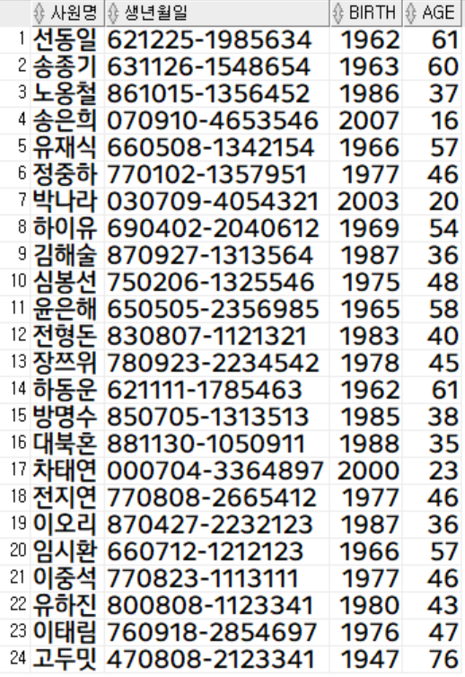 먼저 나이를 구하기 전에 출생년도를 구해야하는데, 주민번호 앞자리를 참고하여 가져와야합니다.
