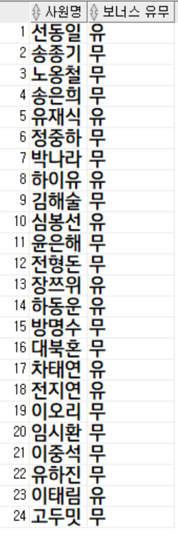 응용) 사원 테이블에서 보너스 유무 조회(사원명, 보너스 유무)