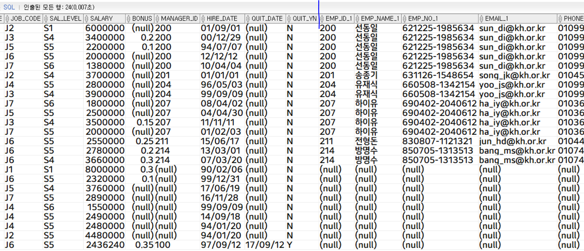 파란 선을 기준으로 왼쪽은 employee e 테이블, 오른쪽은 employee m 테이블입니다.