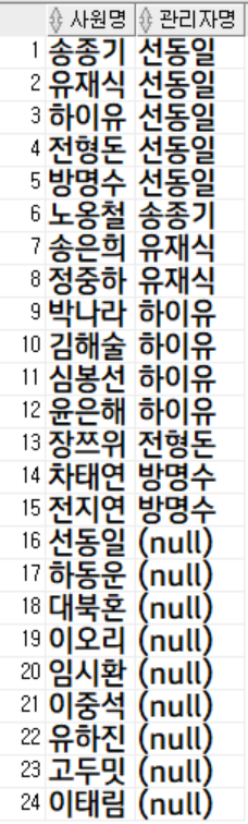 employee e의 manager_id와 employee m의 emp_id가 같을 때 join 하도록 하였고, 관리자가 없는 사원들도 우선 추출하기 위해서 left join을 이용하였습니다.