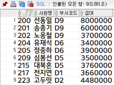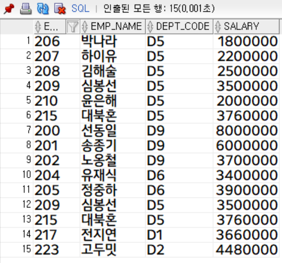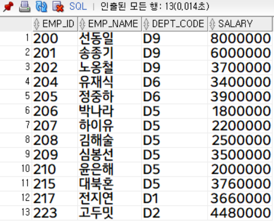 부서코드가 'D5'인 사원은 총 6명, 급여가 300만원 이상인 사원은 총 9명이였지만 union의 결과는 13행입니다.