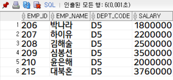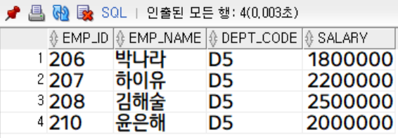 부서코드가 'D5'인 사원 조회 (사번, 사원명, 부서코드, 급여)