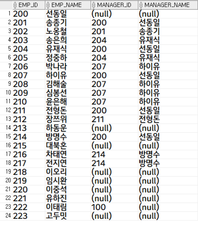 emp_name as manager_name -- 컬럼 타입만 지정해줌 (타입은 emp_name, 컬럼명은 manager_name(별칭))