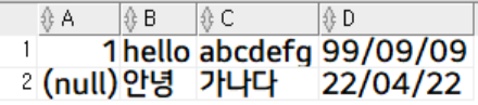 데이터가 추가 된 것을 알 수 있으며, not null이 아닌 컬럼에는 null을 이용하여 null 값을 입력 / default 값인 '안녕'을 입력하기 위해 b 컬럼에 default를 입력해주었습니다.