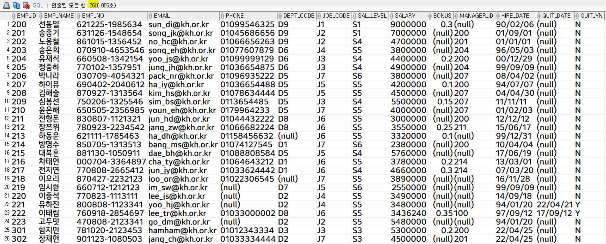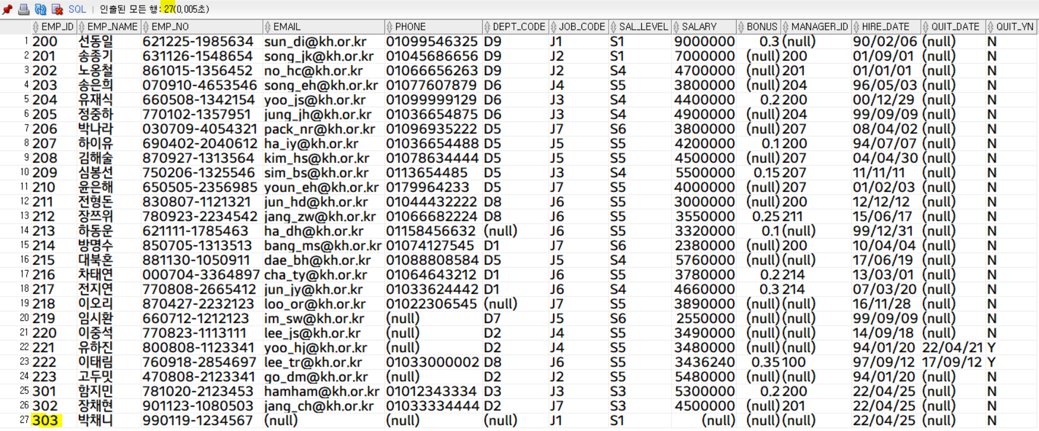 '303'의 사번을 가진 사원이 삭제되어 총 26행이 출력된 것을 확인할 수 있습니다.