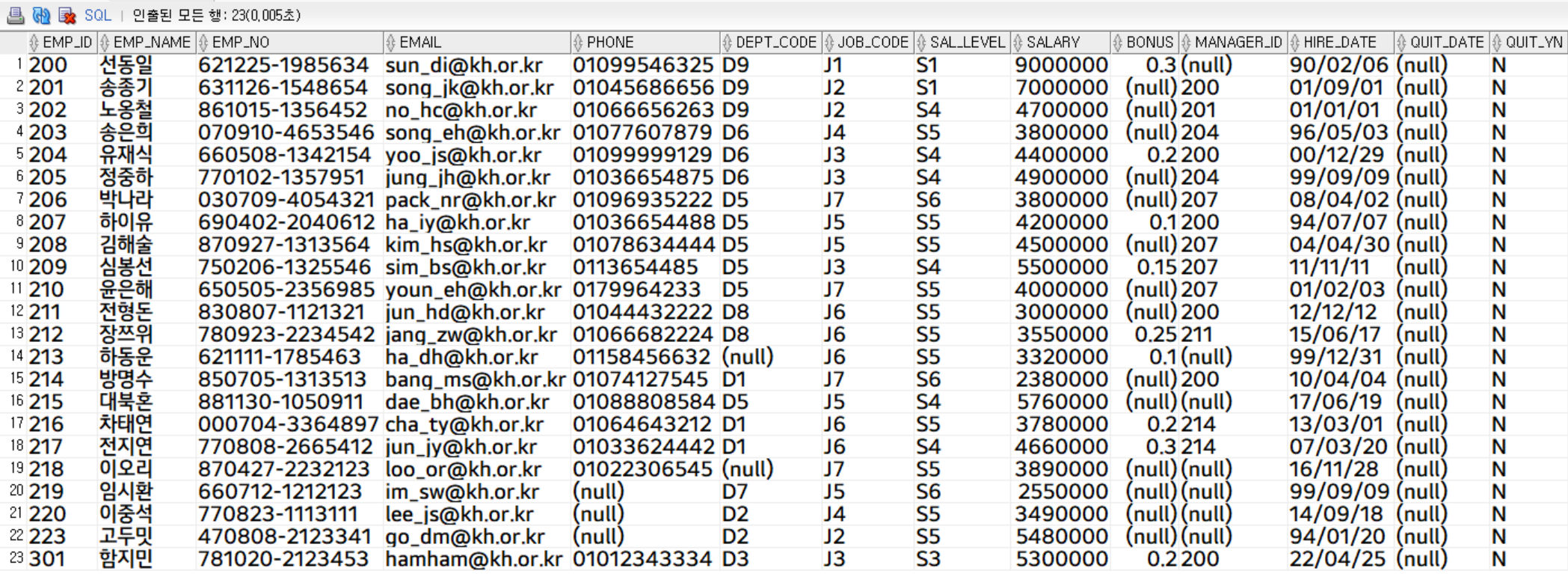 다만, 위처럼 관리하면 보통 사원 조회 때는 조회 되서는 안되므로 항상 where절을 이용해 조회 해야겠죠?