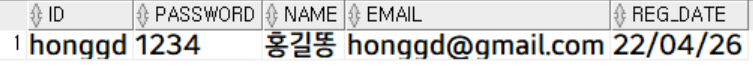 values ('honggd', '1234', '홍길동', 'honggd@gmail.com');
