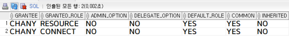 select * from dba_role_privs where grantee = 'CHANY'; -- 롤 조회