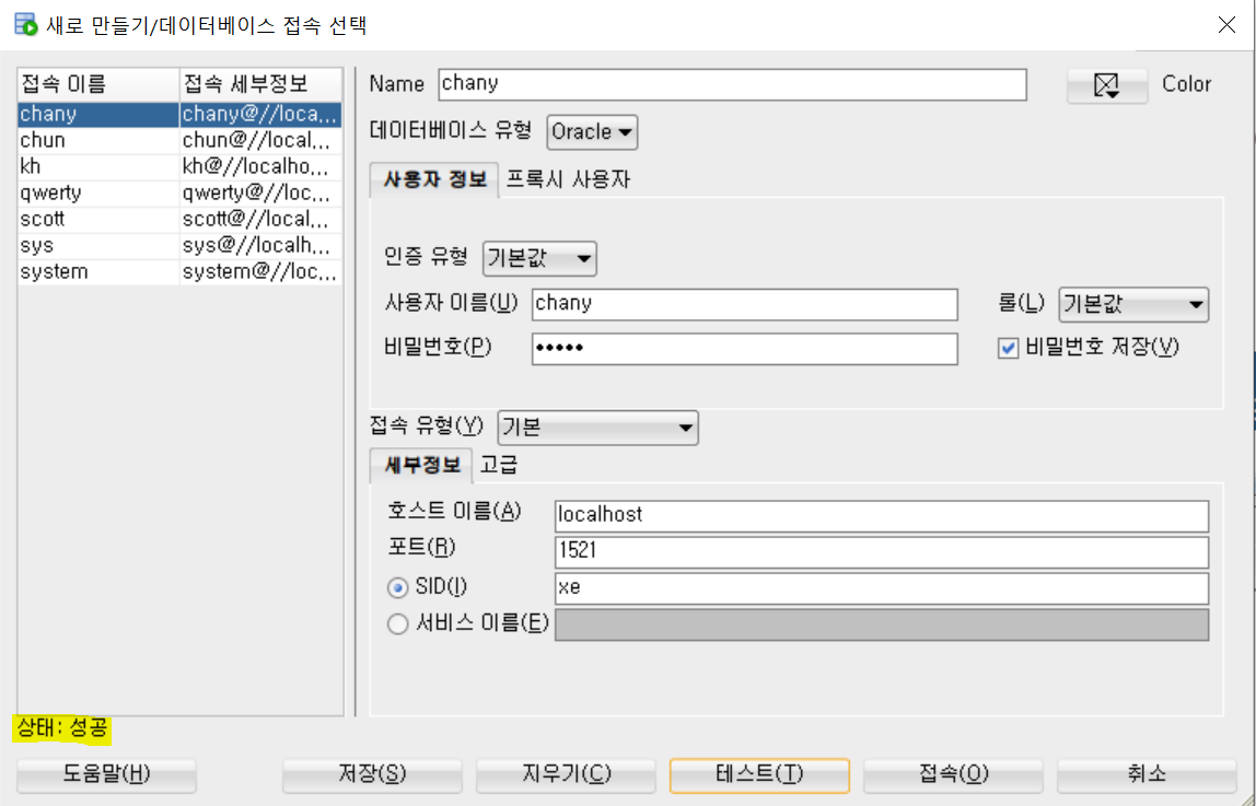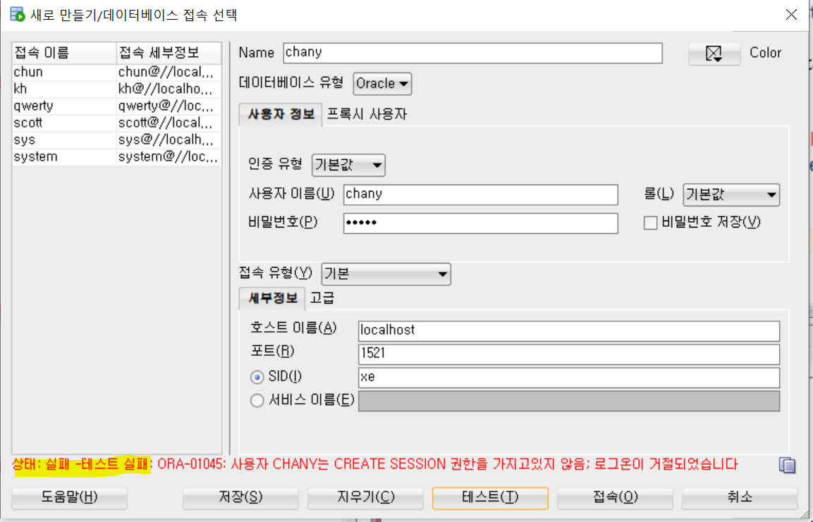 "상태: 실패 -테스트 실패: ORA-01045: 사용자 CHANY는 CREATE SESSION 권한을 가지고있지 않음; 로그온이 거절되었습니다" 이와 같은 메세지가 출력 되는 것을 확인 할 수 있습니다.