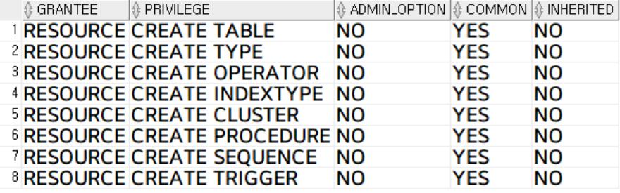select * from dba_sys_privs where grantee = 'RESOURCE'; -- resource 롤 안에 권한 조회