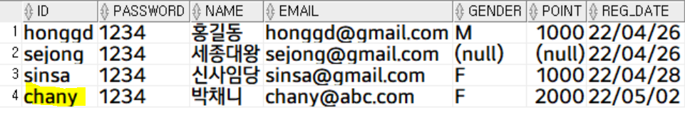values('chany', '1234', '박채니', 'chany@abc.com', 'F', '2000', default);