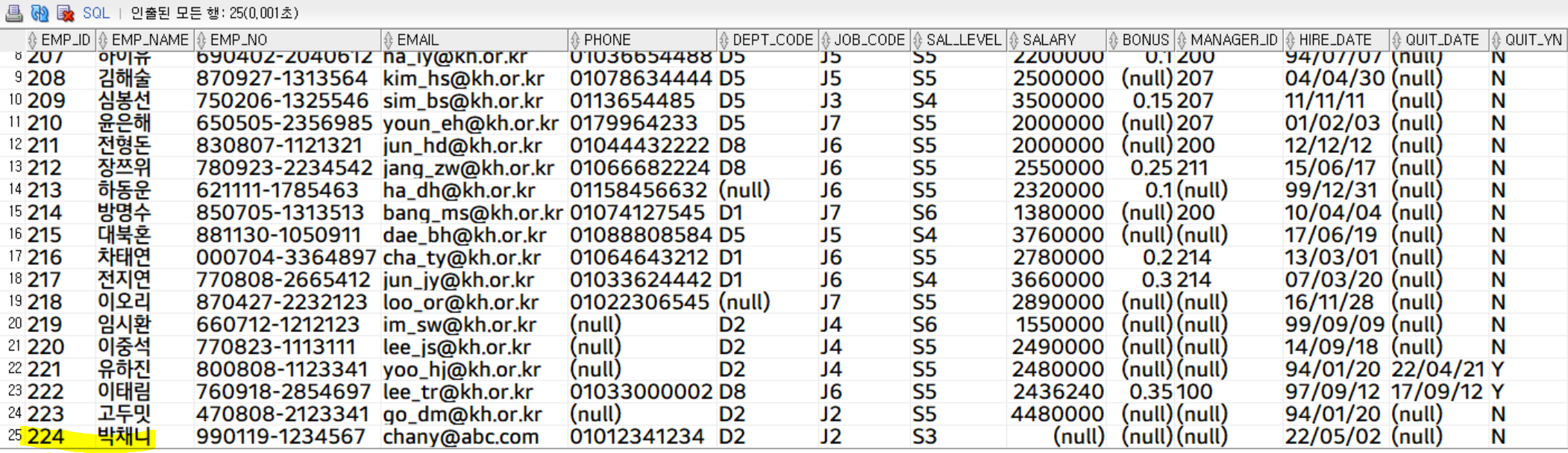 employee_ex (emp_id, emp_name, emp_no, email, phone, dept_code, job_code, sal_level)