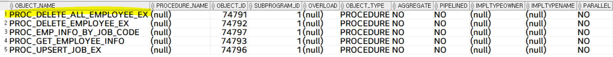 생성된 procedure 객체 확인