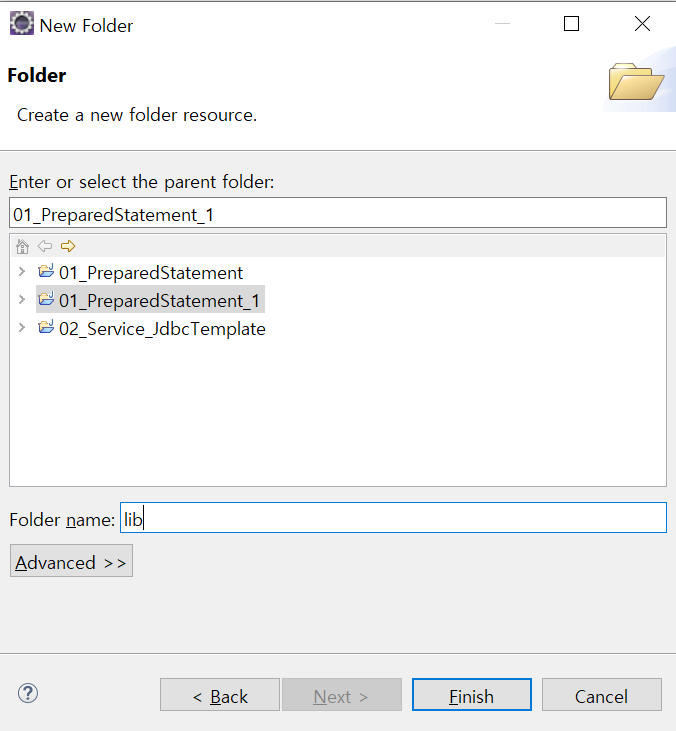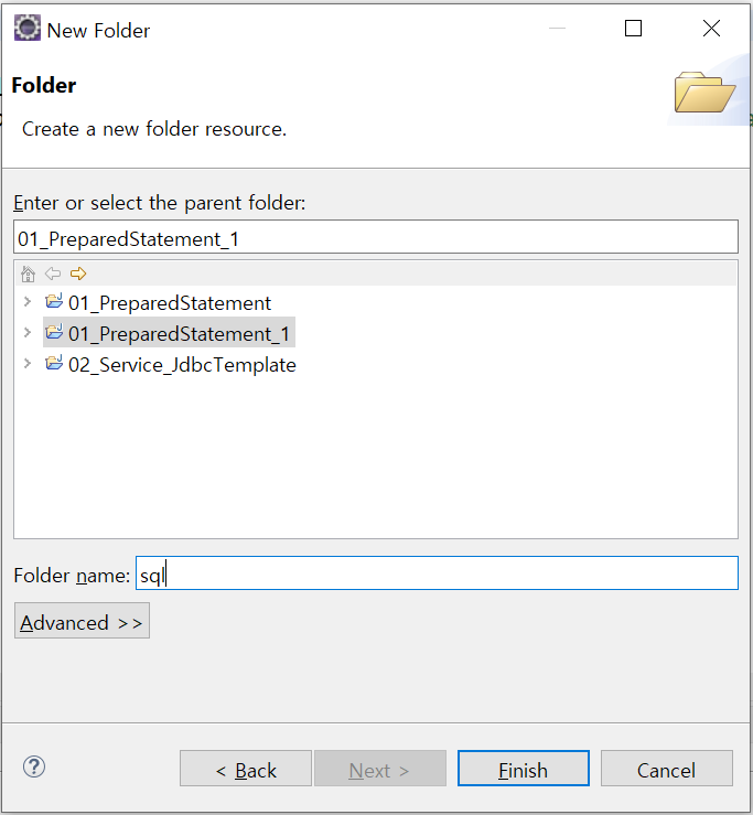 폴더명을 'sql'로 설정하고 Finish 버튼 클릭!