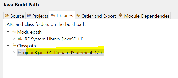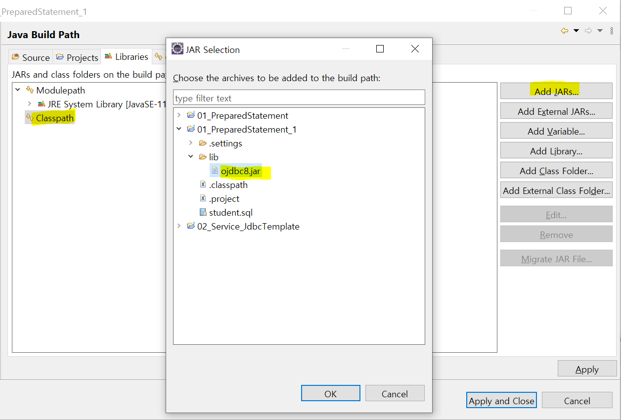 외부 라이브러리는 Classpath - Add JARs - lib 하위의 ojdbc8.jar 연결 - OK