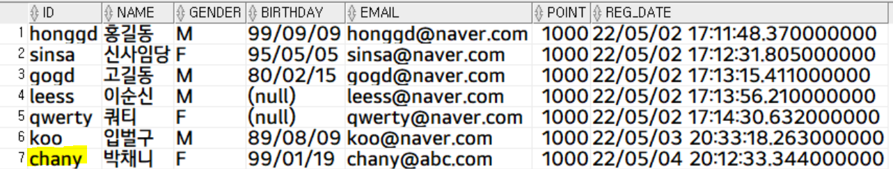 String sql = "insert into member values (?, ?, ?, ?, ?, default, default)";