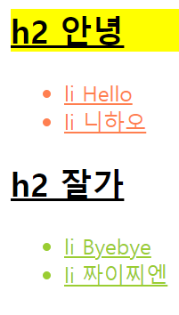 <li style="color:hotpink; text-decoration: underline;">HTML요소의 inline style속성 작성</li>
