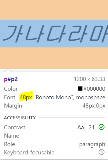 'Roboto Mono'는 한글을 지원해주지 않기때문에 p2의 한글은 폰트 적용이 안된 것을 확인할 수 있습니다.