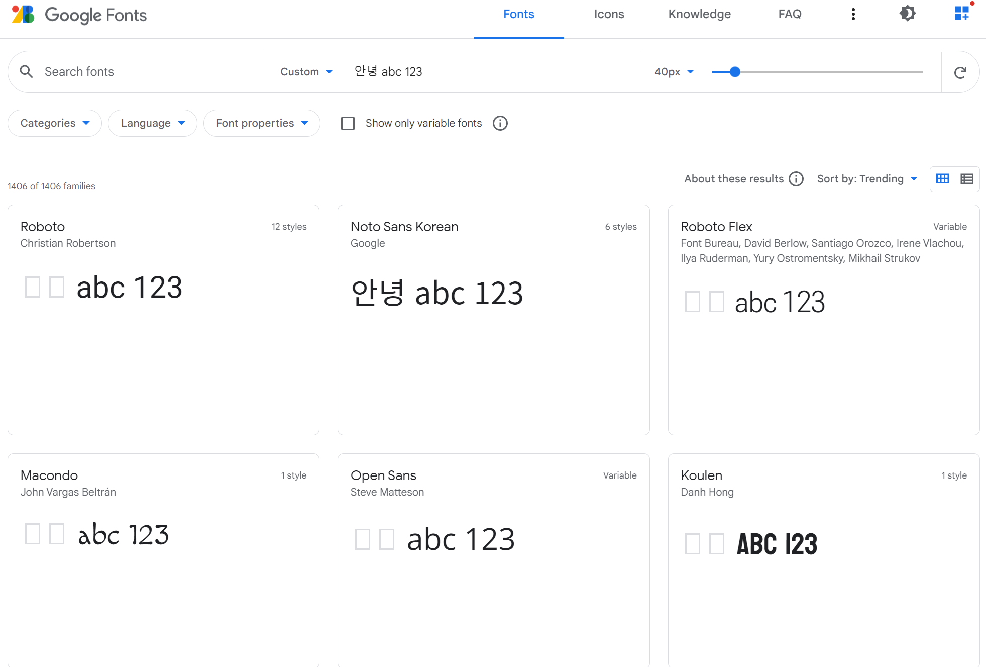 구글 웹폰트에서 마음에 드는 폰트를 골라 추가해주는데, 여기서 한글을 지원해주지 않는 폰트들이 꽤 있으니 사전에 체크가 필요합니다.