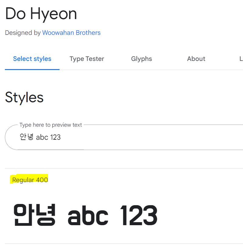 폰트 굵기를 100 ~ 900까지 지원해주는데, 'Do Hyeon' 폰트는 400까지만 지원 해주는 것을 확인할 수 있습니다.