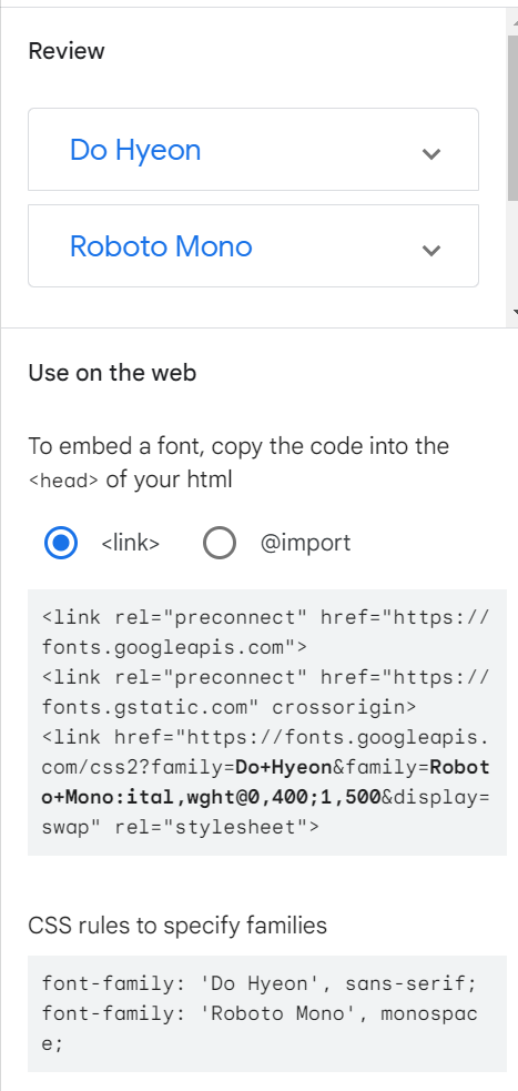 <link href="https://fonts.googleapis.com/css2?family=Do+Hyeon&family=Roboto+Mono:ital,wght@0,400;1,500&display=swap" rel="stylesheet">