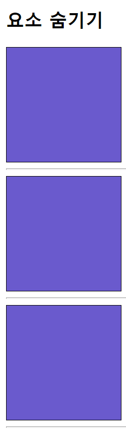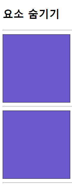 visibility: hidden 처럼 요소는 숨겨졌지만, 차지하던 자리는 사라지지 않고 텅 비어있는 것을 확인할 수 있습니다.