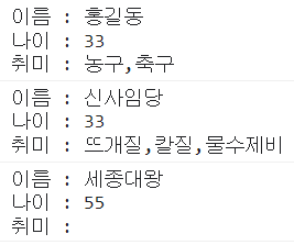 info('홍길동', 33, '농구', '축구');
