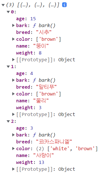 bark()메소드의 return 값은 this.weight > 10 ? '왈왈' : '멍멍'인데 this를 잃어버렸기 때문에 모두 '멍멍'으로 출력되는 것을 확인할 수 있습니다.