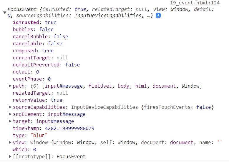 focus가 아웃되면 blur 이벤트가 발생하는 것을 알 수 있습니다.