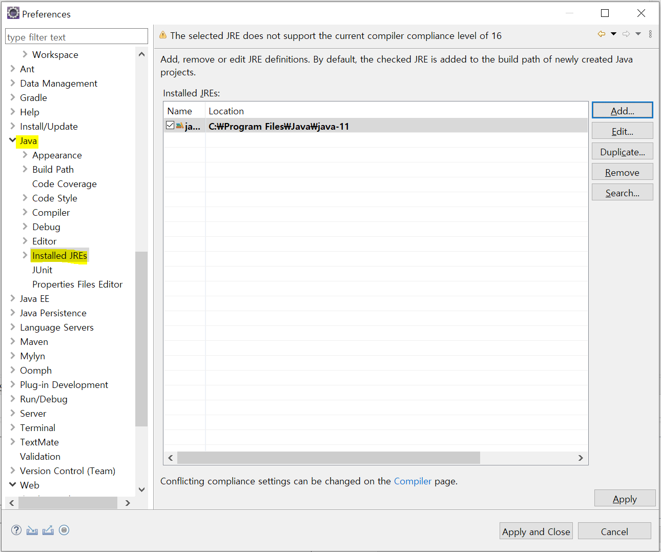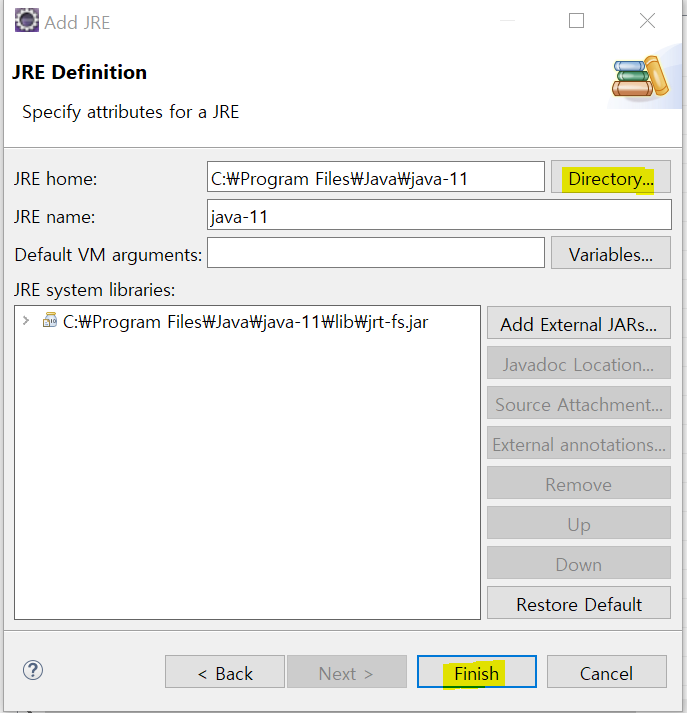 Window - Preferences - Java - Installed JREs - 기존에 있던 것은 Remove 해준 후 Add