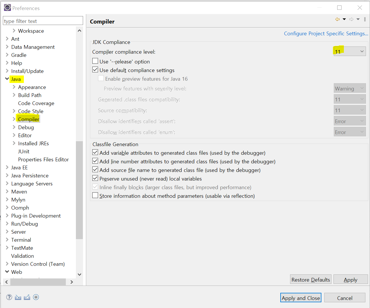 Window - Preferences - Java - Compiler - level : 11(본인 버전에 맞게)