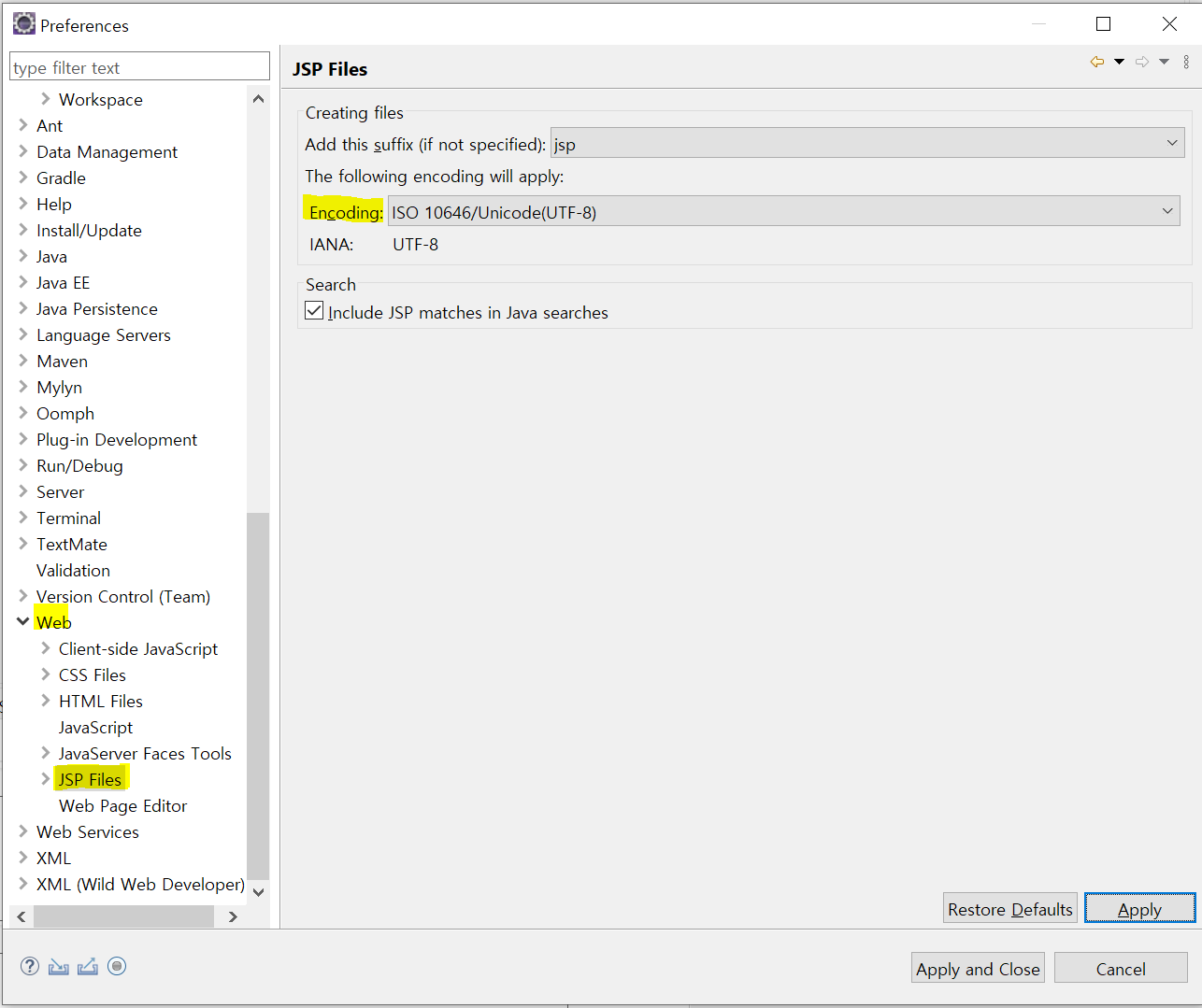 Window - Preferences - Web - JSP Files - Encoding : UTF-8