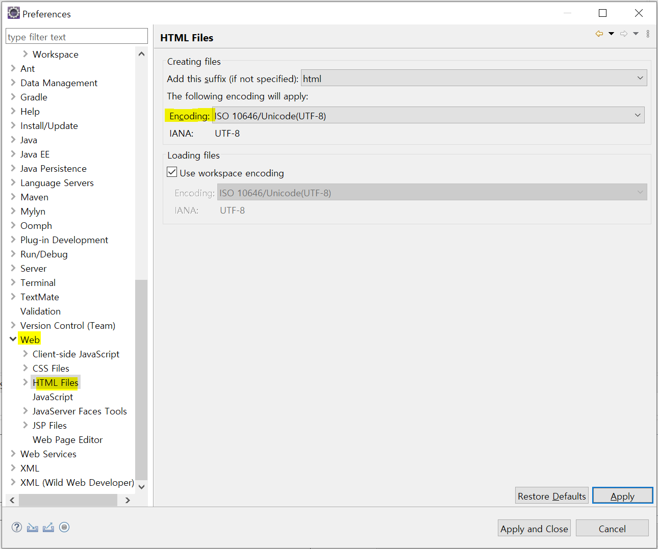 Window - Preferences - Web - HTML Files - Encoding : UTF-8