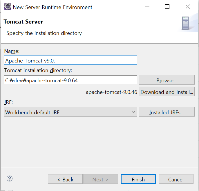 Tomcat이 설치되어있는 디렉토리를 선택해줍니다. (설치한 apache-tomcat의 디렉토리를 CATALINA_HOME이라고 함)