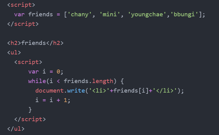 while ( i < 4 )가 아닌, while ( i < friends.length ) 값을 주어서 배열 값을 편리하게 변경할 수 있게 해 주었습니다.