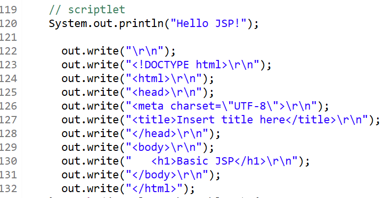out.write(" <h1>Basic JSP</h1>\r\n");