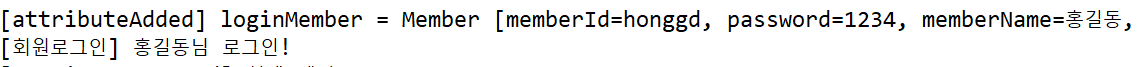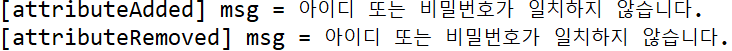 아이디/비밀번호를 잘못 입력하였을 때 발생하는 msg는 한 번만 표시해주기 위하여 alert 실행 후 제거가 되었으므로 attributedAdded 메소드가 실행되고 attributeRemoved 메소드가 연이어서 실행된 것을 확인할 수 있습니다.