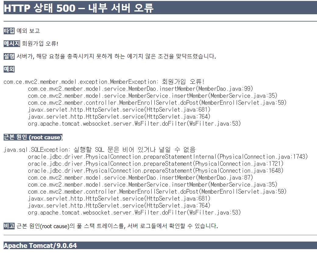 throw e; // WAS(tomcat) 예외 던짐 -> 에러페이지를 응답출력