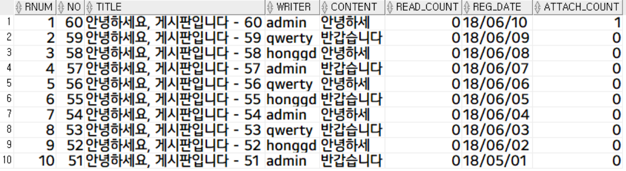 // findAll = select * from (select row_number () over (order by no desc) rnum, b.*, (select count(*) from attachment where board_no = b.no) attach_count from board b) b where rnum between ? and ?